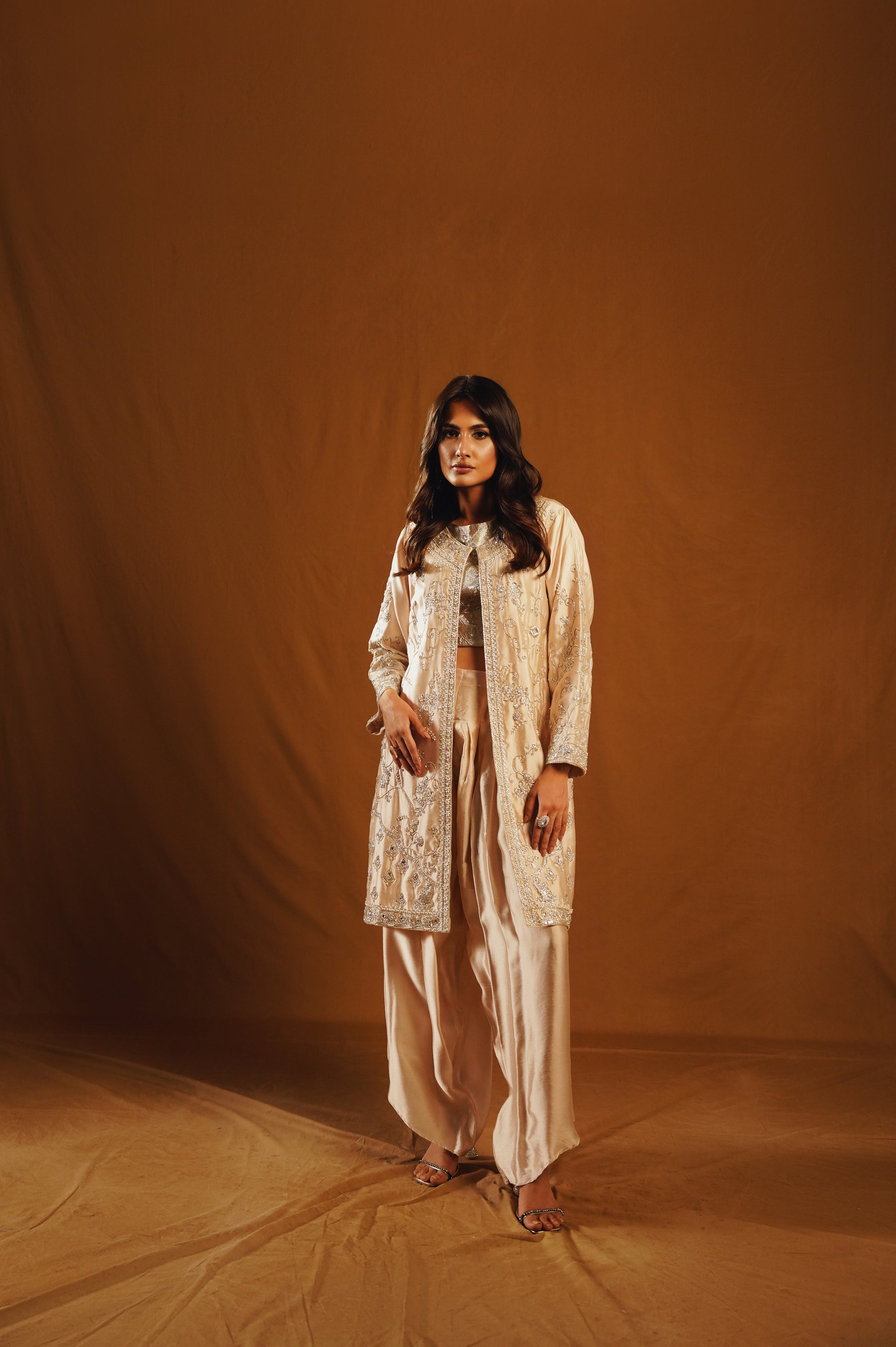 A graceful ivory ensemble in tissue silk, exquisitely adorned with silver embellishments all over. The design features a short front-open jacket paired with a two-piece set, complemented by a beautifully tailored pleated lower. With its refined details and fluid silhouette, this outfit embodies timeless sophistication and modern elegance.