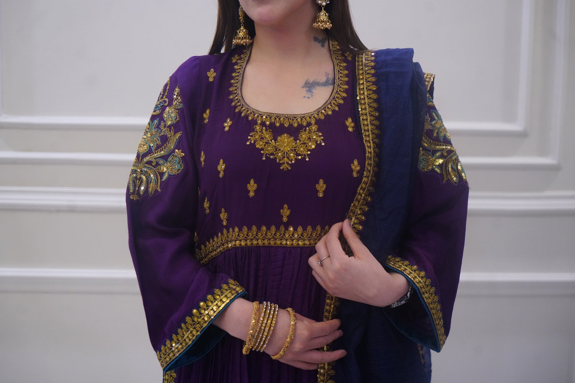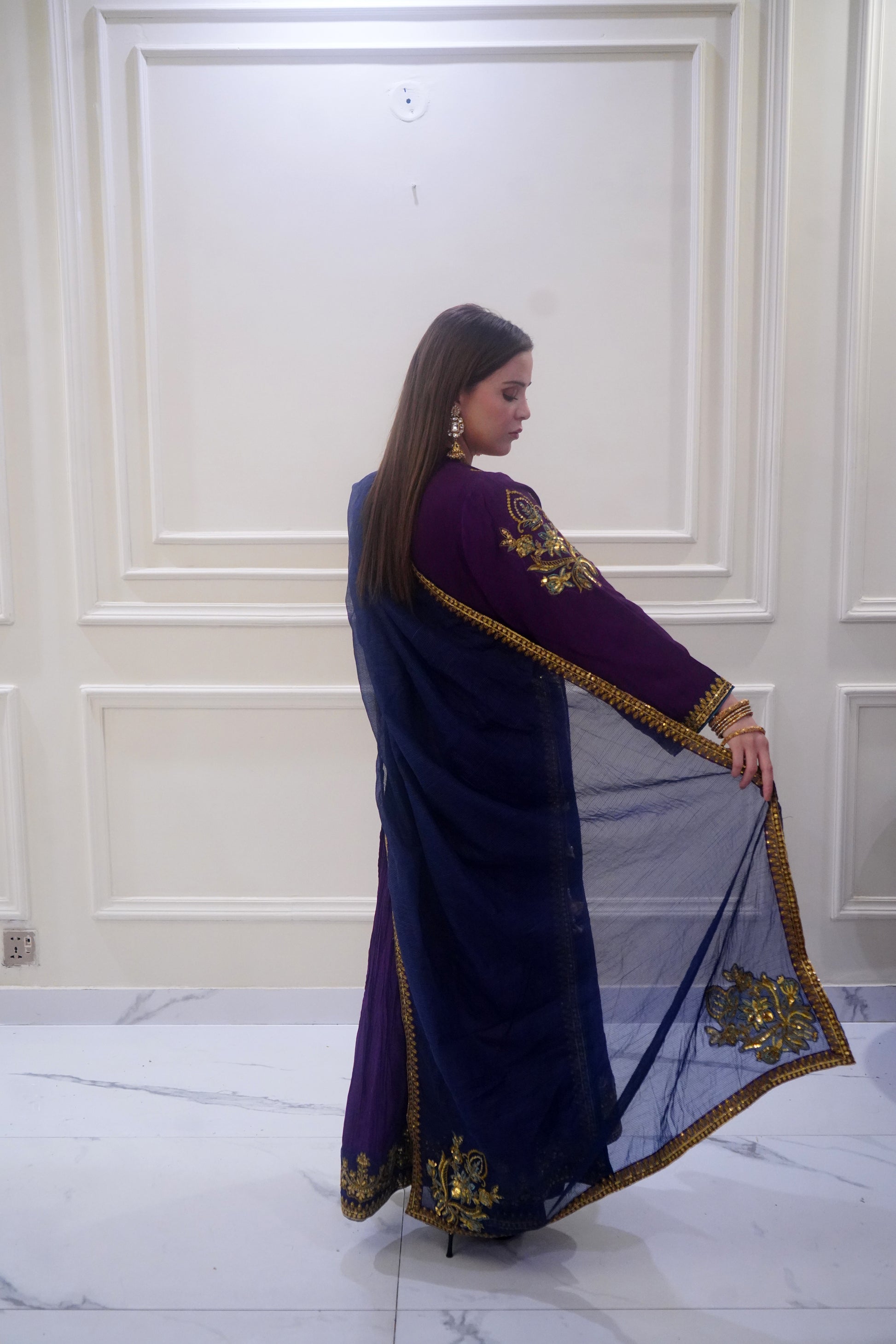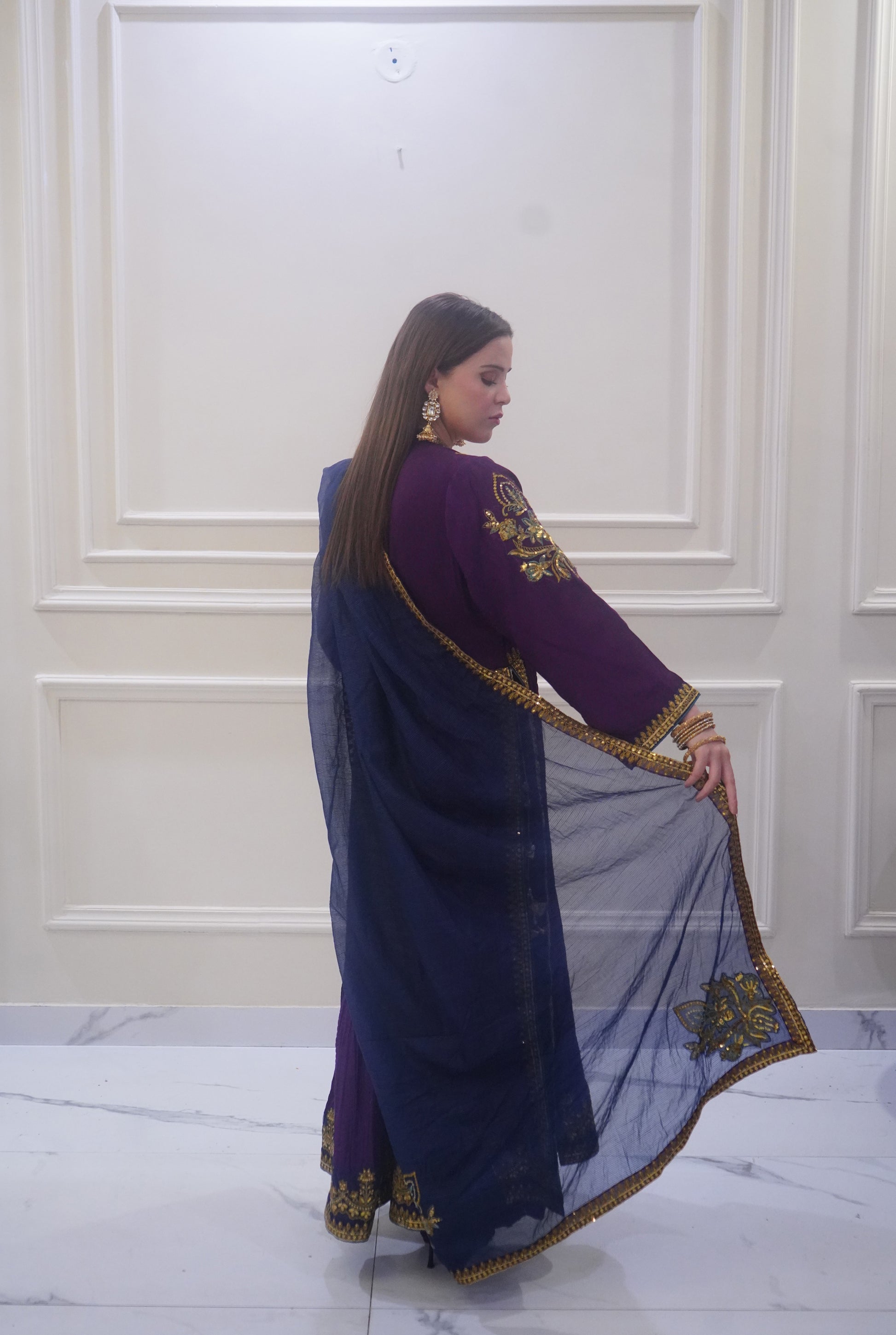 A Striking Plum dress on grip fabric adorned with rich gold emrboidery and embellishment with sequin detials. outfit is enhanced with teal and gold appliques with structured pleates on the front and back, with tasseb on side slit.