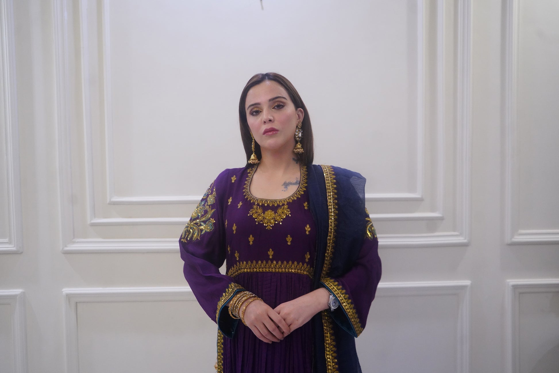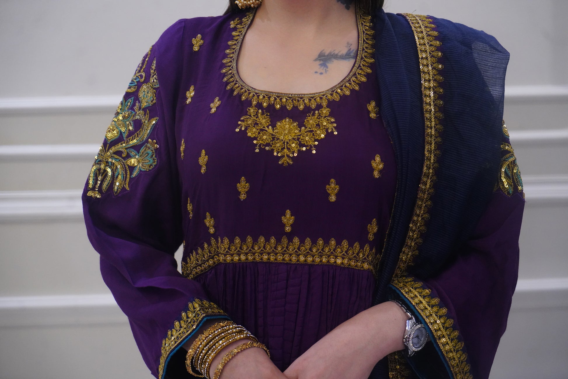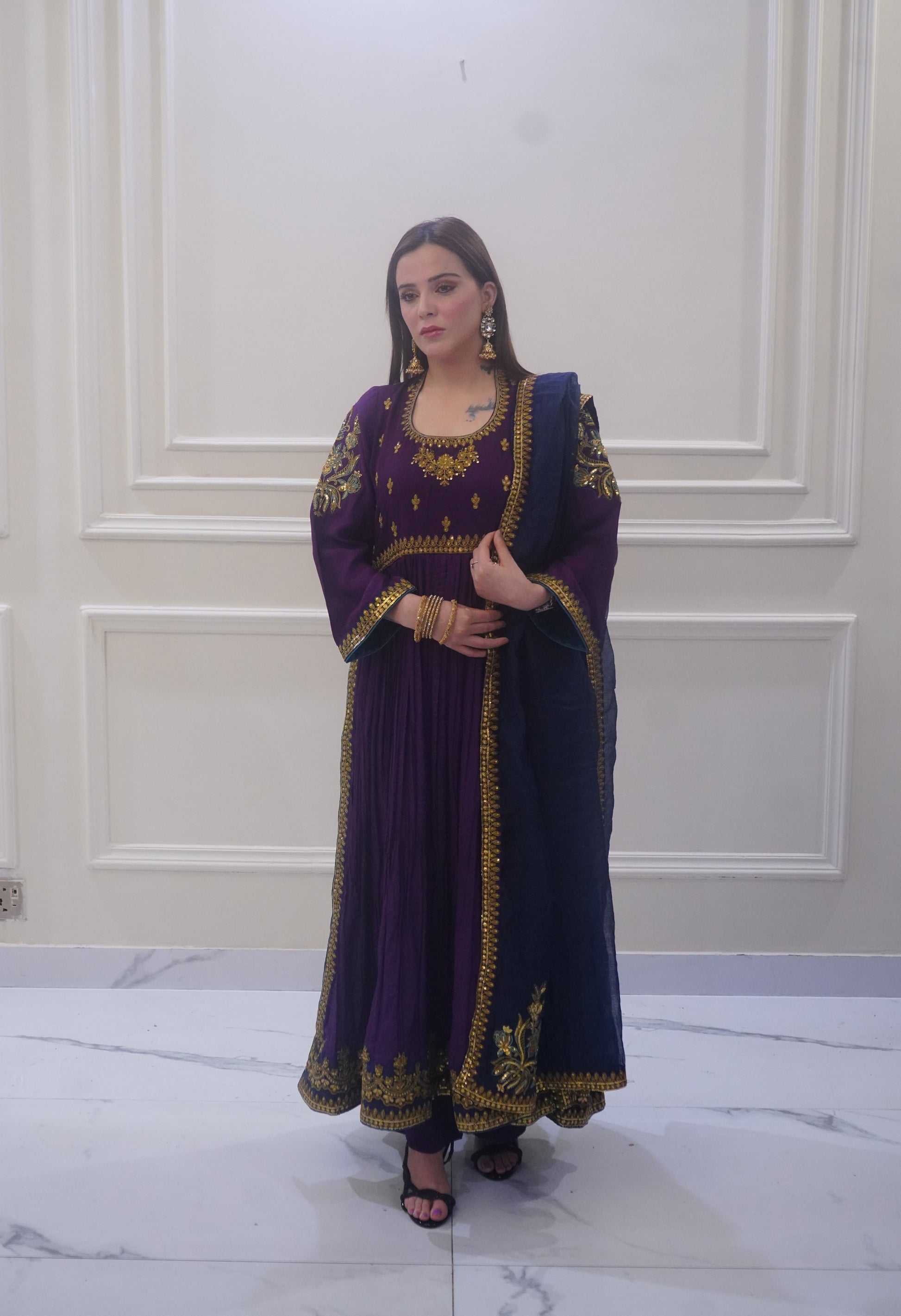 A Striking Plum dress on grip fabric adorned with rich gold emrboidery and embellishment with sequin detials. outfit is enhanced with teal and gold appliques with structured pleates on the front and back, with tasseb on side slit.