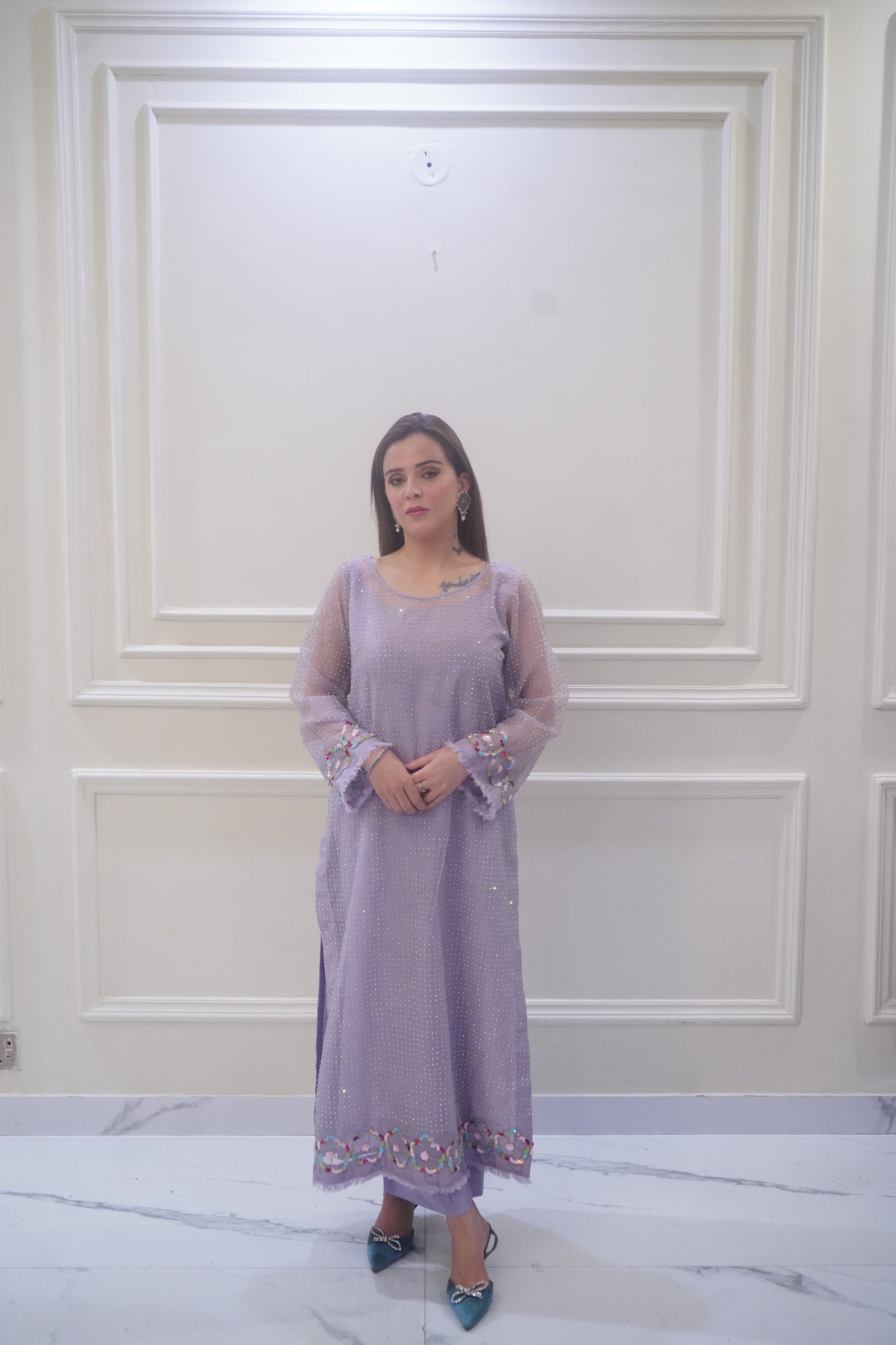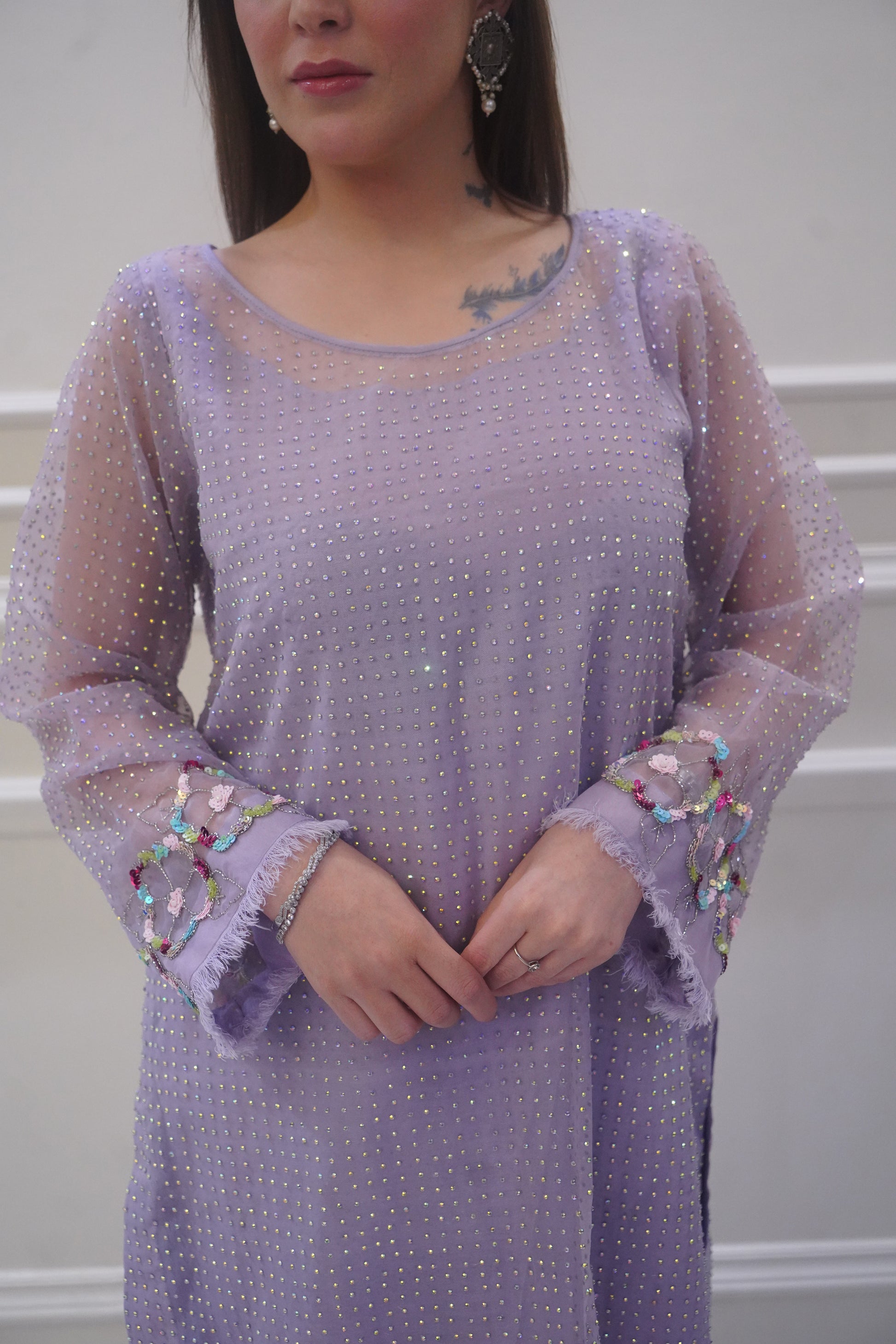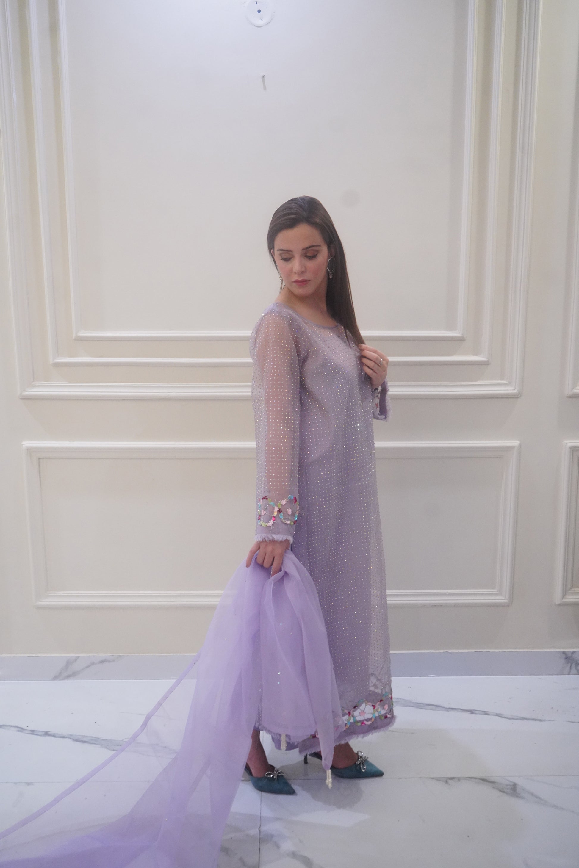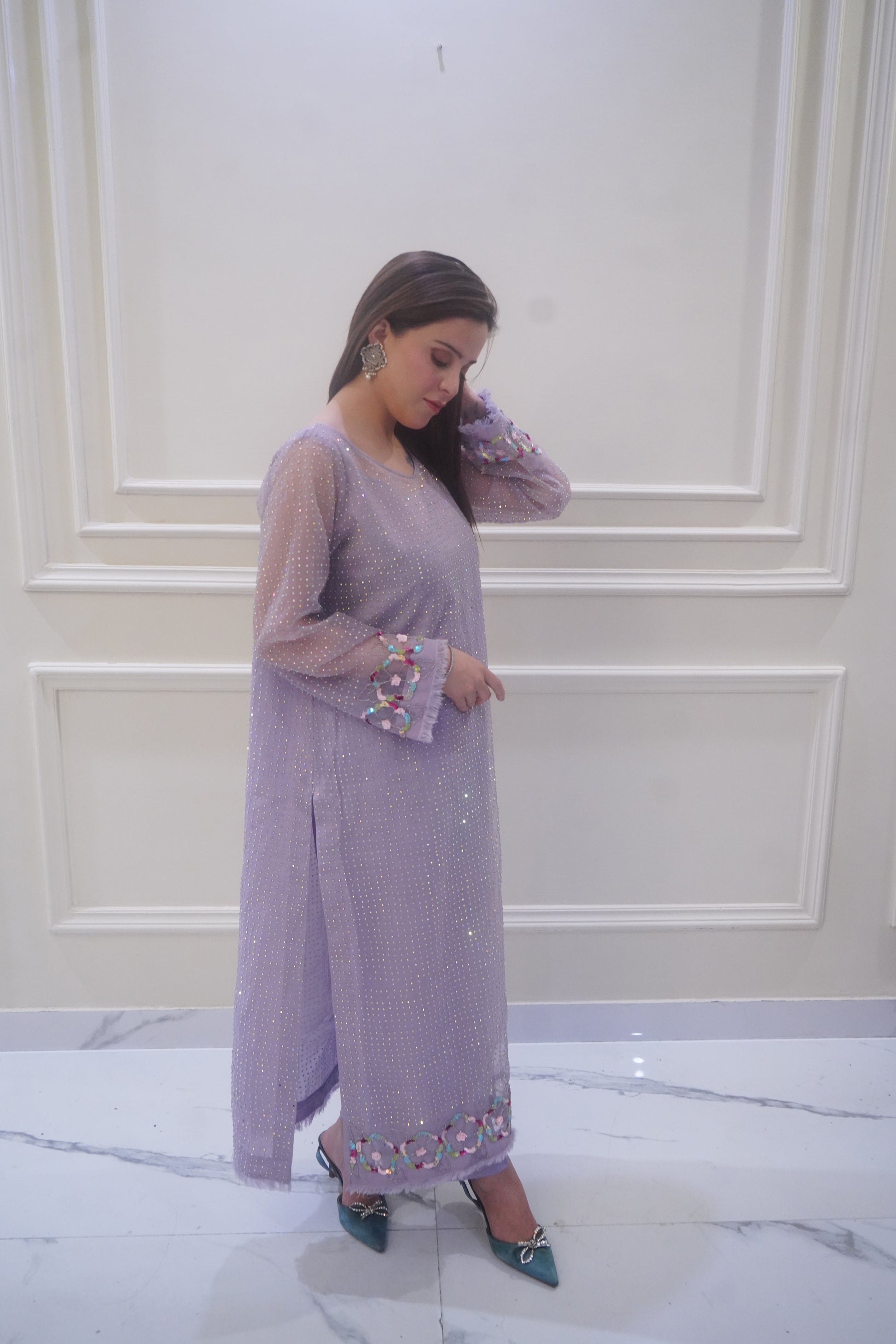 A Dreamy enchanting outfit with shimmering sworouski details. Features a straight A-Line Long shirt with handwork on sleaves and hemline. Paired with matching dupatta and trousers.