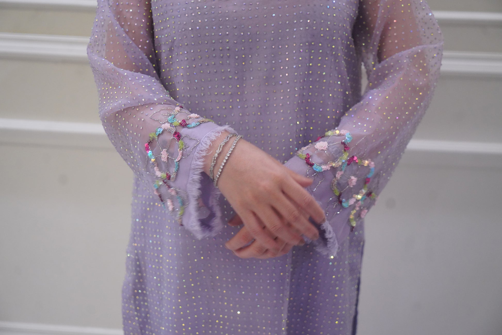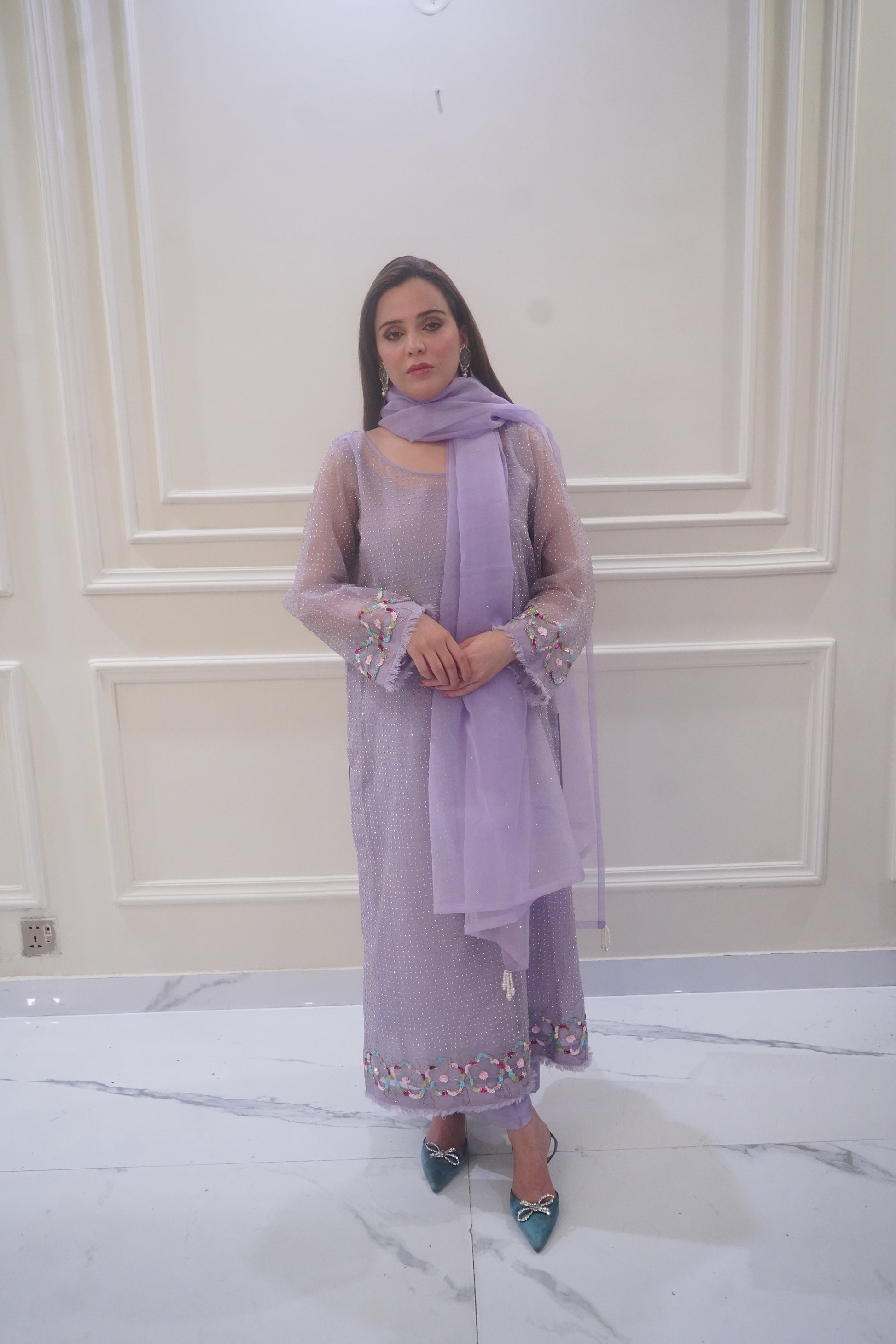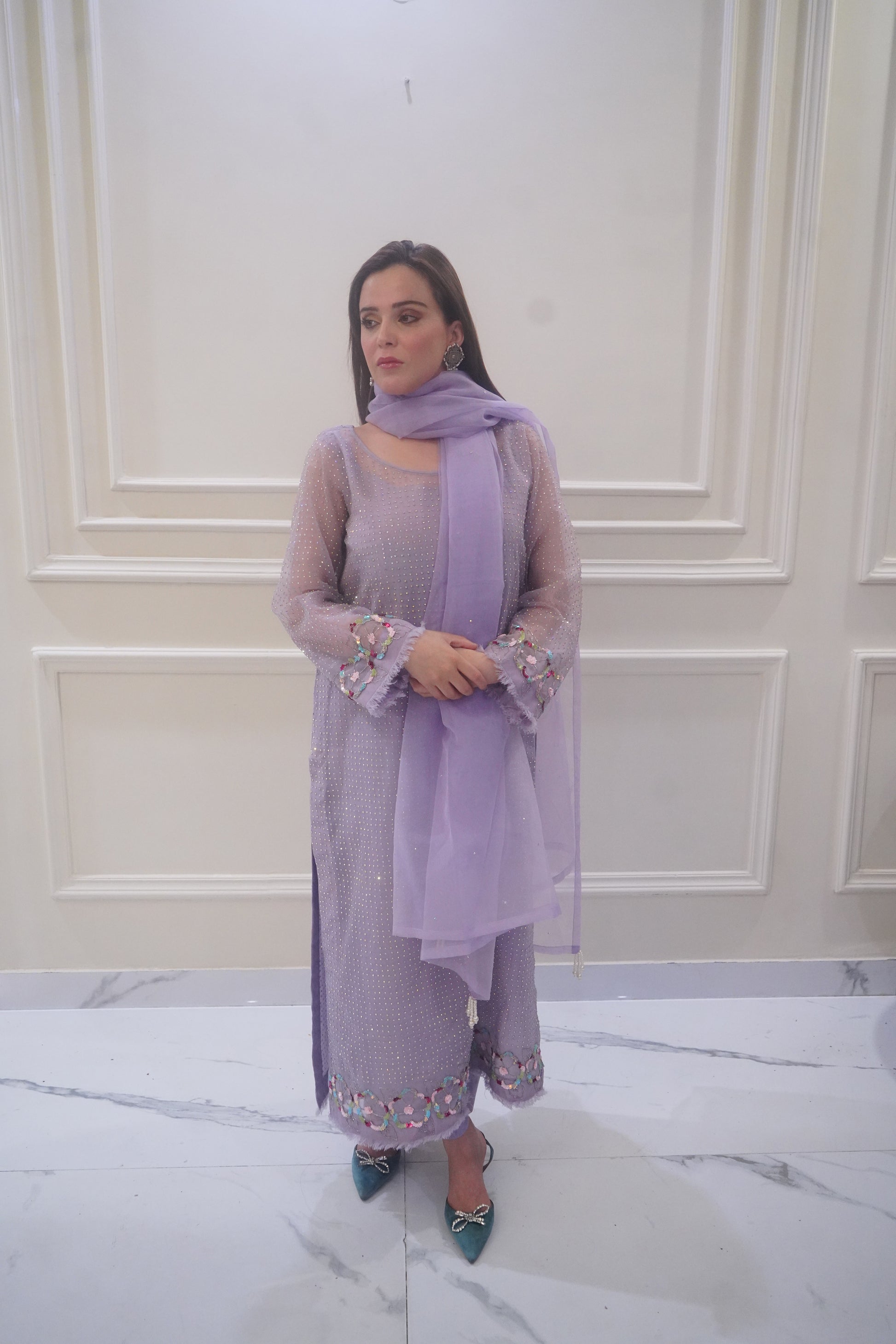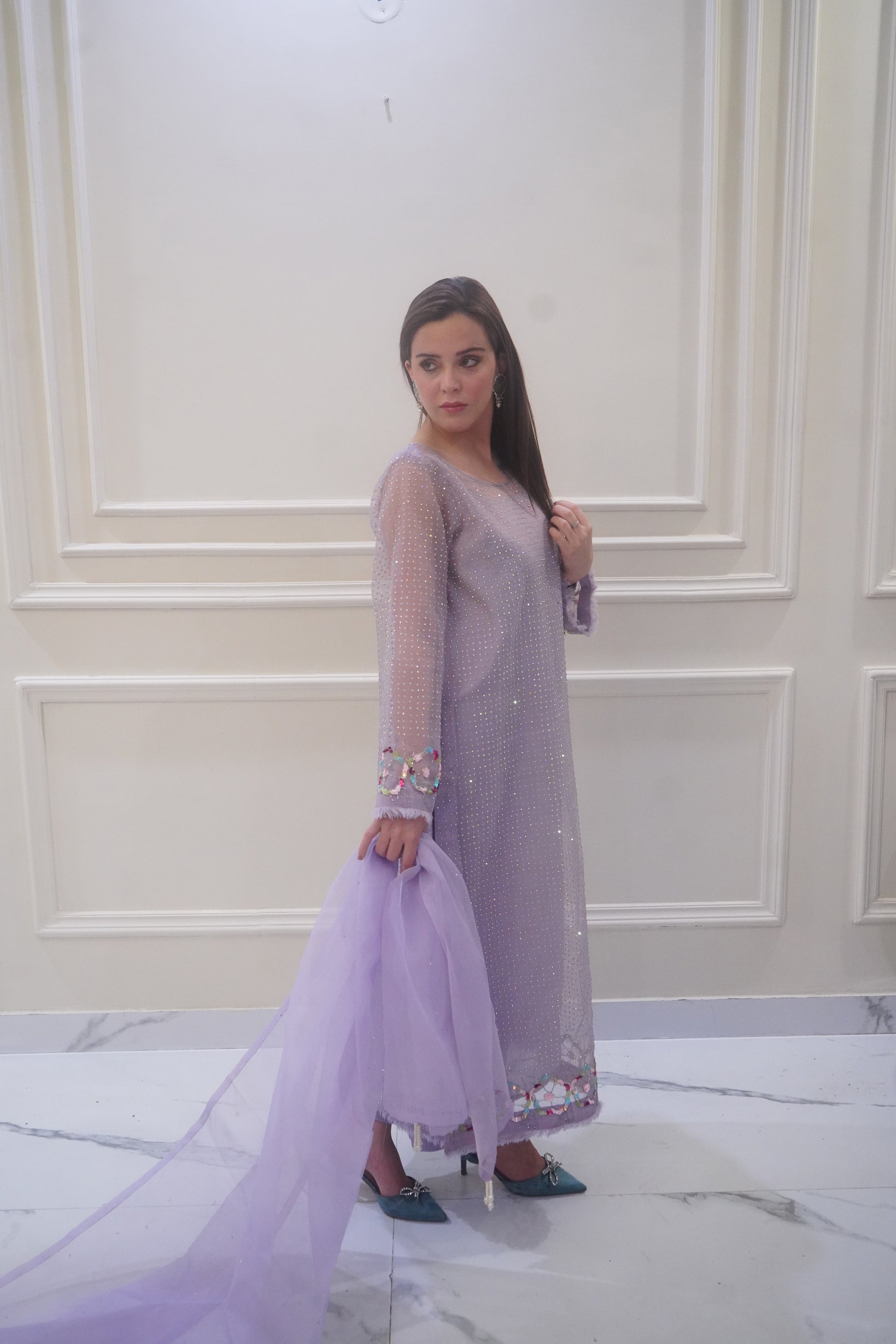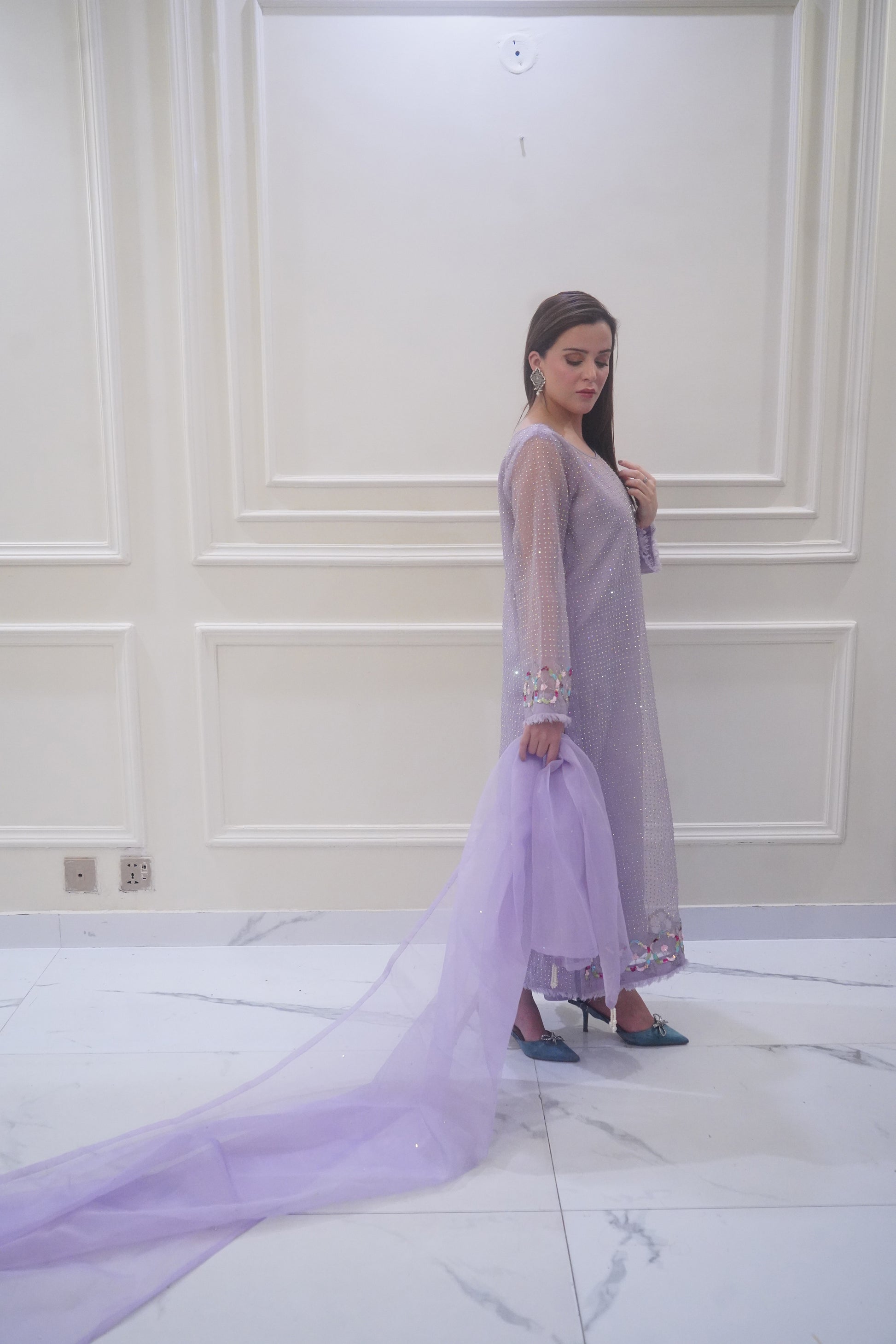 A Dreamy enchanting outfit with shimmering sworouski details. Features a straight A-Line Long shirt with handwork on sleaves and hemline. Paired with matching dupatta and trousers.